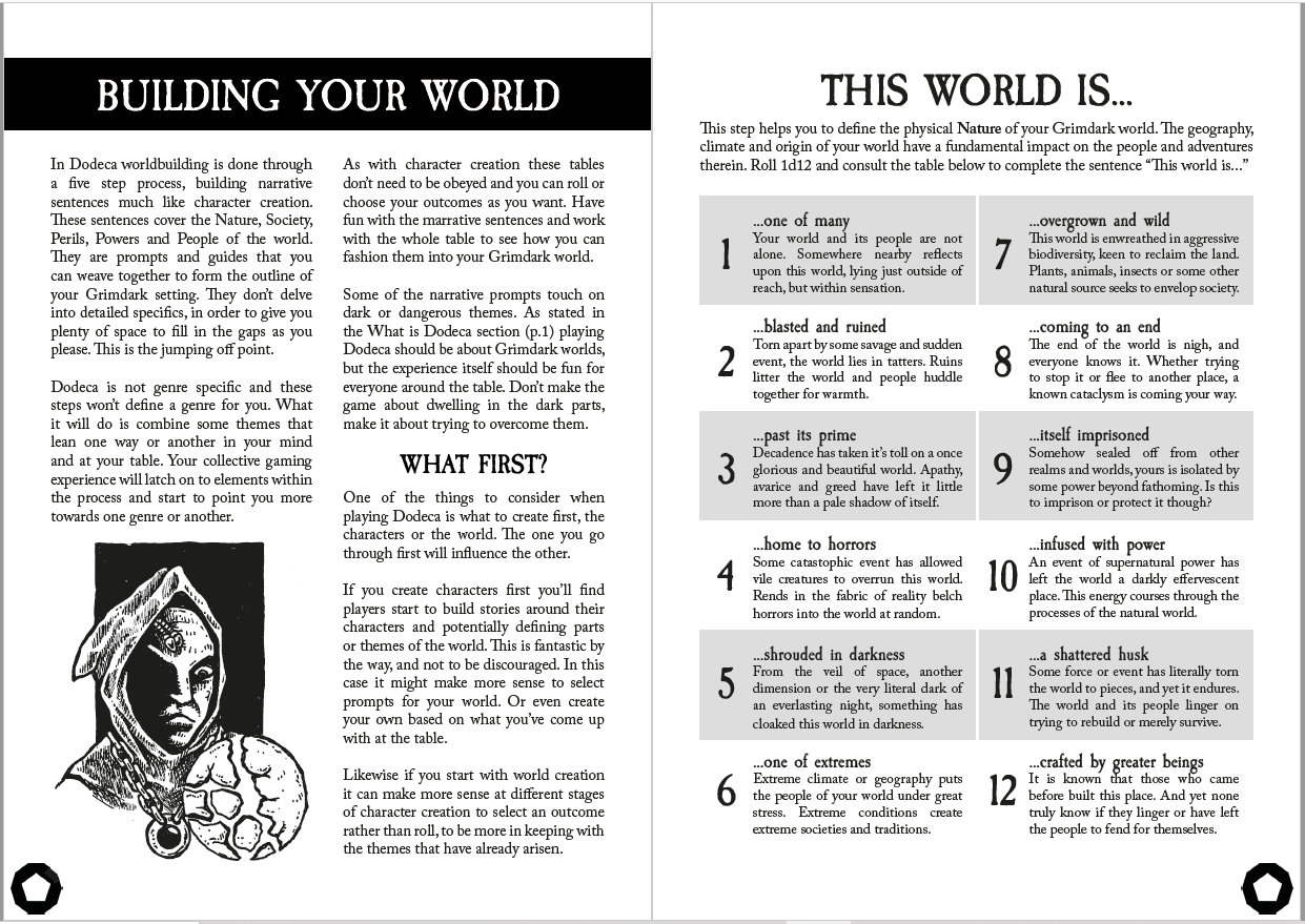 Much like characters, the world through which you explore and struggle can be created collaboratively by generating or choosing narrative prompts. Will you be questing across a fantasy land controlled by a cruel overlord, fighting the fascist authorities of a dystopian future or evading cannibal bikers on the shattered roads of a post-apocalyptic world. Dodeca allows you to build this grimdark world together!
